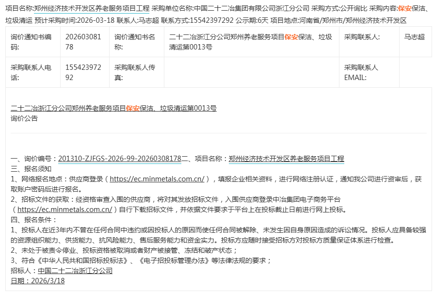 一、项目基本情况 1、采购项目编号:郑财招标采购-2026-5 2、采购项目名称:郑州师范学院安保服务项目 3、采购方式:公开招标 4、招标公告发布日期:2026年02月25日 5、评审日期:2026