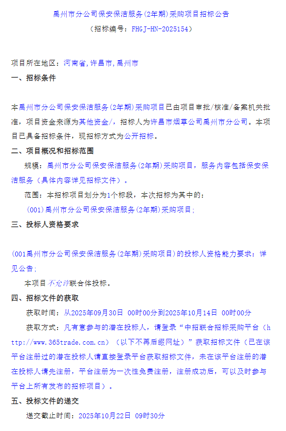 项目概况 平顶山职业技术学院保安服务项目招标项目的潜在投标人应在潜在投标人须在平顶山市公共资源电子化交易系统中,下载招标文件。获取招标文件,并于2025年10月30日08时40分(北京时间)前递交投标