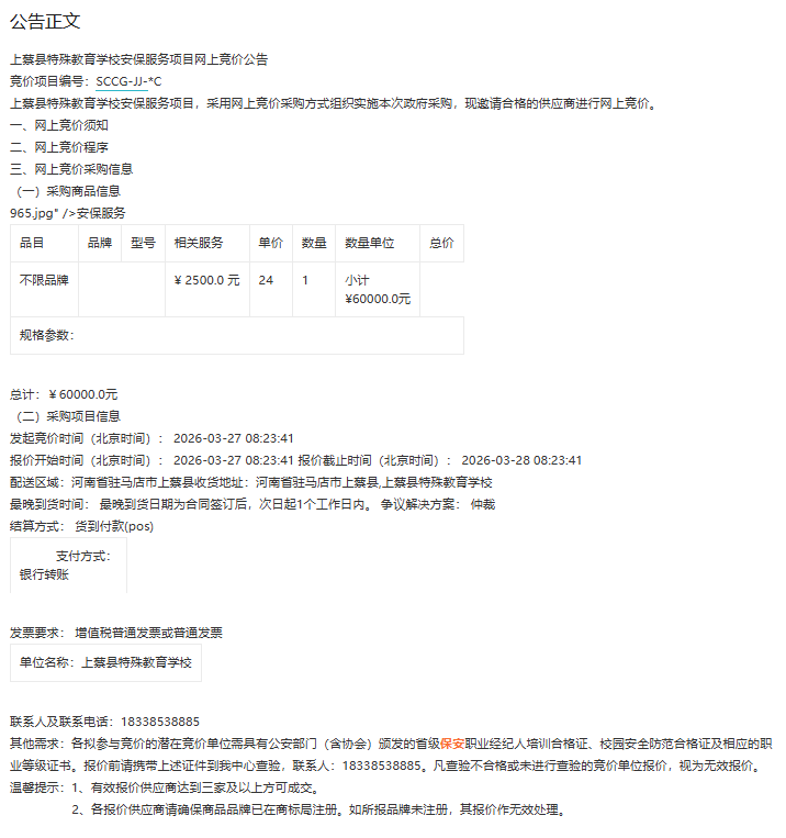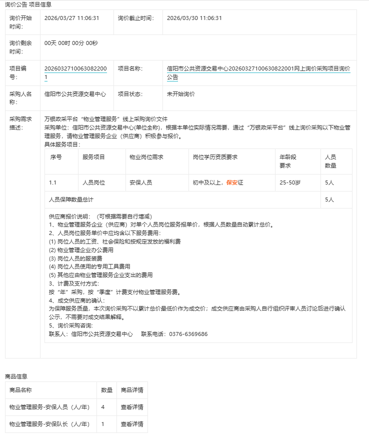 济源联通 2026 年保安服务(框架)项目招标公告(招标编号:SS37102604001655) 项目所在地区:河南省,省直辖县级行政区划,济源市 一、招标条件 本济源联通 2026 年保安服务(框架