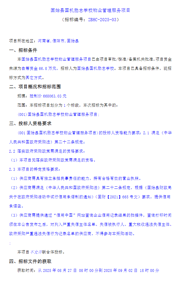 一、项目基本情况 1、项目编号:HHZB-2025-ZC016 2、项目名称:河东第二棚户区6号地物业管理服务项目 3、招标方式:公开招标 4、项目预算:本项目住宅最高限价0.95元/月/平方米,商业