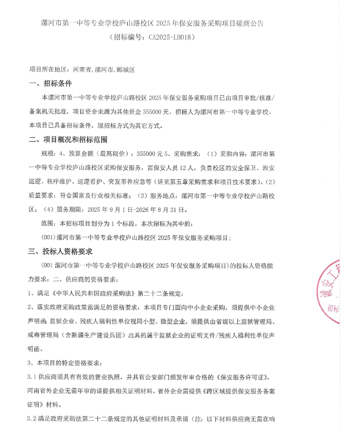 一、项目概况: 1、项目名称:郑州市第四十四初级中学保安服务项目 2、项目编号:HNGC-2025-230-磋商 3、采购内容:郑州市第四十四初级中学保安服务(详见竞争性磋商文件) 4、项目预算:21