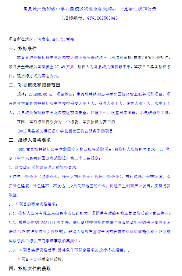 项目概况 郏县第一高级中学物业管理服务项目招标项目的潜在投标人应在平顶山市公共资源交易中心系统获取招标文件,并于2025年08月15日09时30分(北京时间)前递交响应文件。 一、项目基本情况 1、项