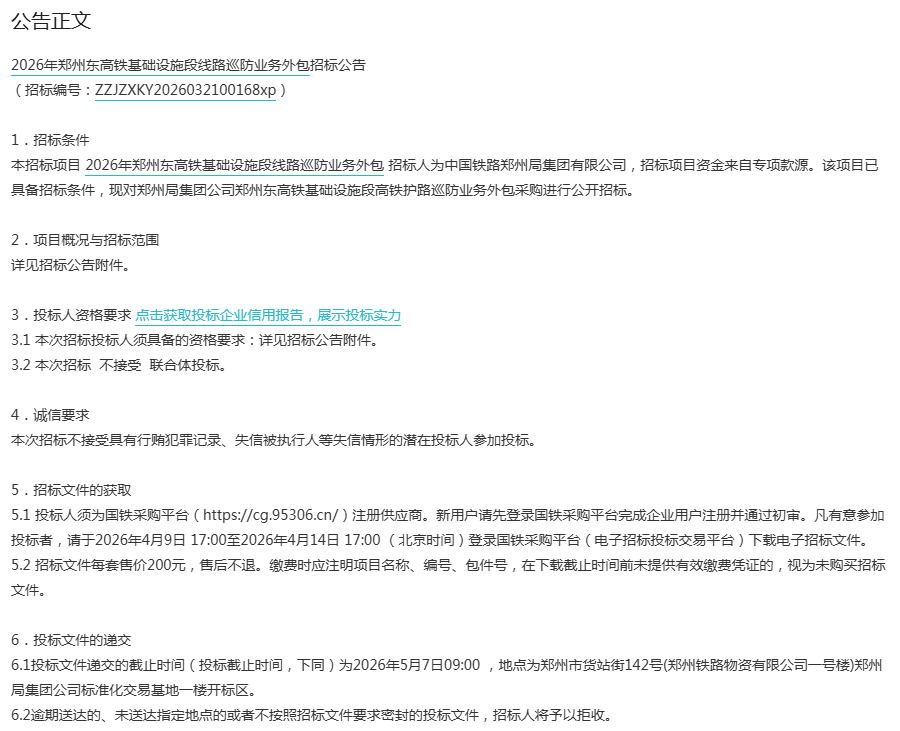 2026年安阳综合段瓦日线护路巡防业务外包招标公告 (招标编号:ZZJZXKY2026032100168oi) 1.招标条件 本招标项目 2026年安阳综合段瓦日线护路巡防业务外包 招标人为中国铁路郑