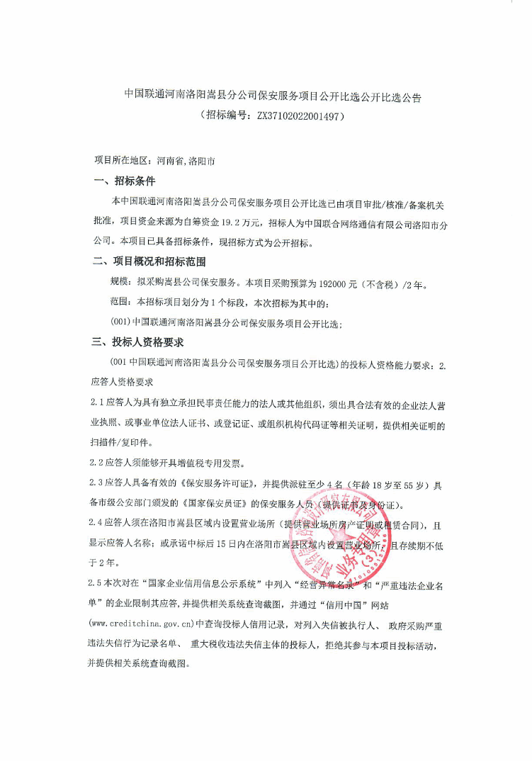 本比选项目为中国联通河南洛阳嵩县分公司保安服务项目公开比选(采购代理编号:ZX37102022001497),采购人为中国联合网络通信有限公司洛阳市分公司,采购代理机构为河南省信息咨询设计研究有限公司