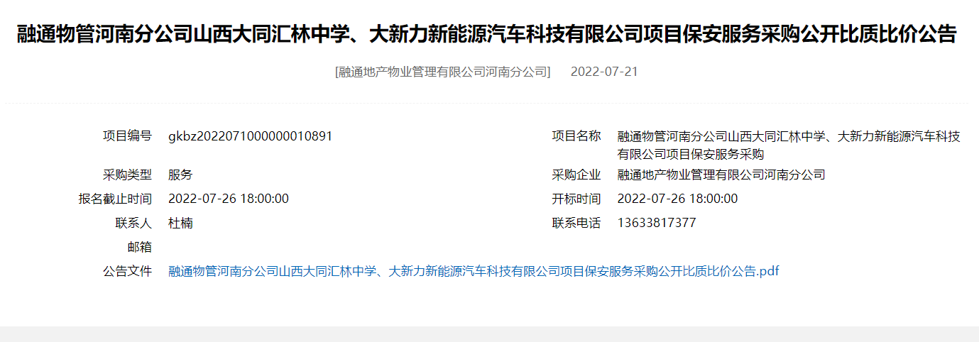 融通物管河南分公司山西大同汇林中学、大新力新能源汽车科技有限公司项目保安服务采购公开比质比价公告.pdf