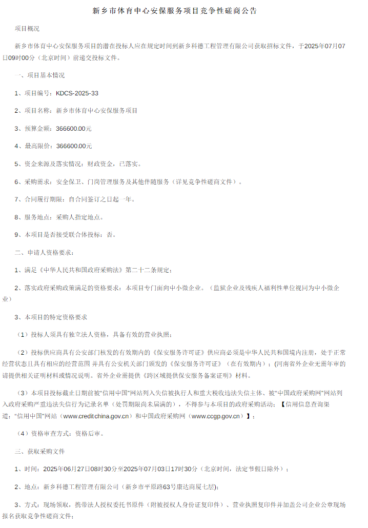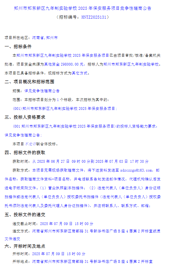 郑州市郑东新区九年制实验学校2025年保安服务项目竞争性磋商公告