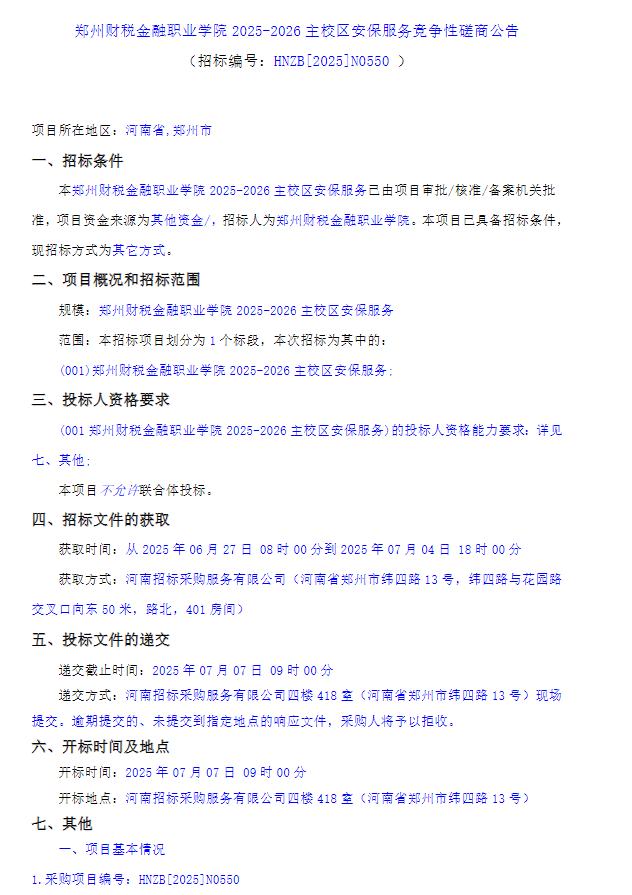 郑州财税金融职业学院2025-2026主校区安保服务竞争性磋商公告