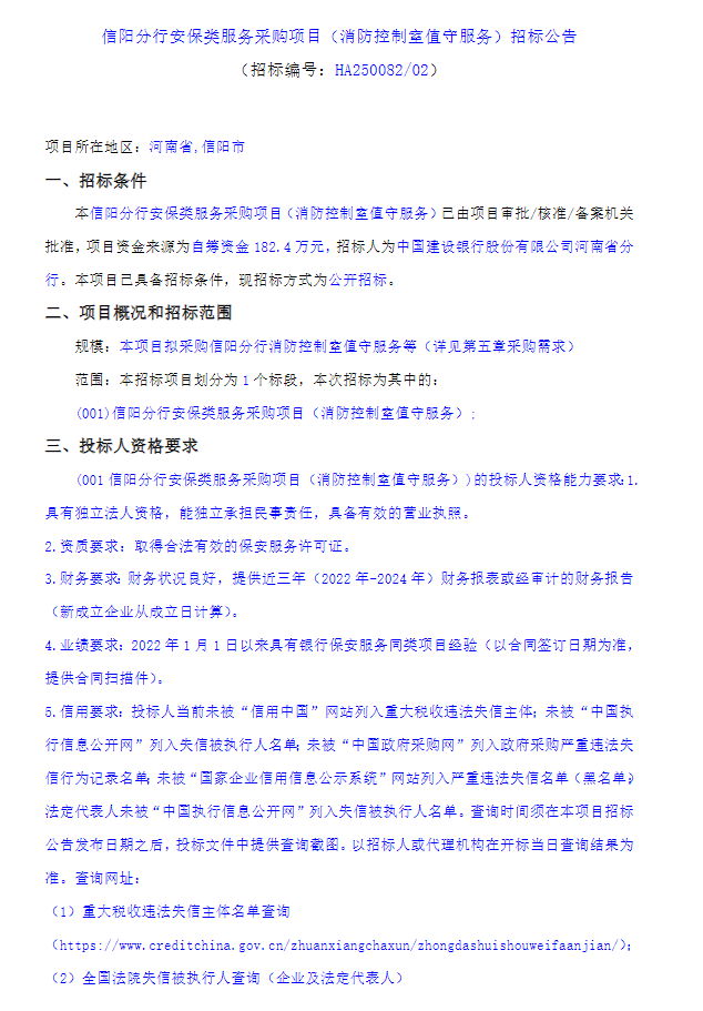 信阳分行安保类服务采购项目(消防控制室值守服务)招标公告