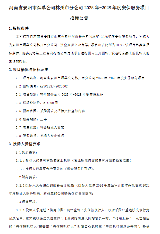 河南省安阳市烟草公司林州市分公司2025年-2028年度安保服务项目-公开招标公告