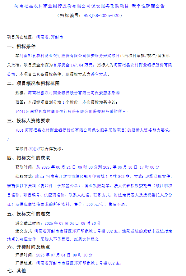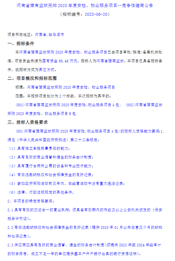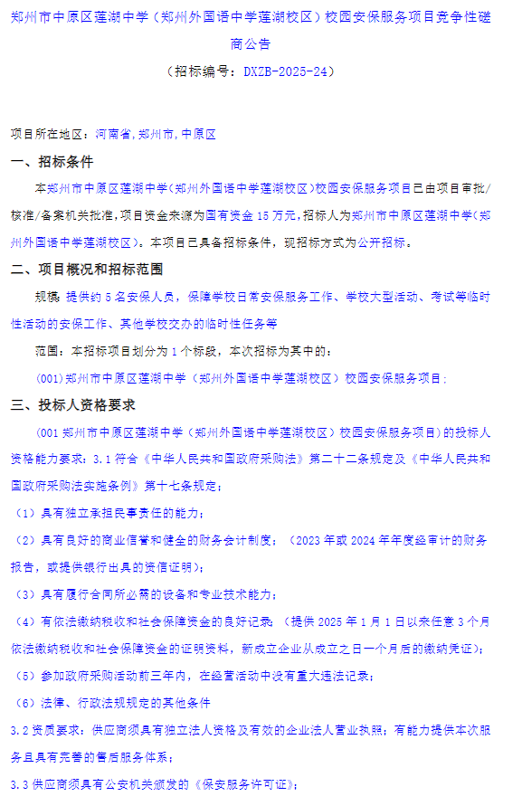 荥阳市人民医院2025-2027年度安保服务项目竞争性磋商公告 项目概况 荥阳市人民医院2025-2027年度安保服务项目的潜在供应商应使用CA数字证书登录荥阳市公共资源交易中心网站获取磋商文件,并于