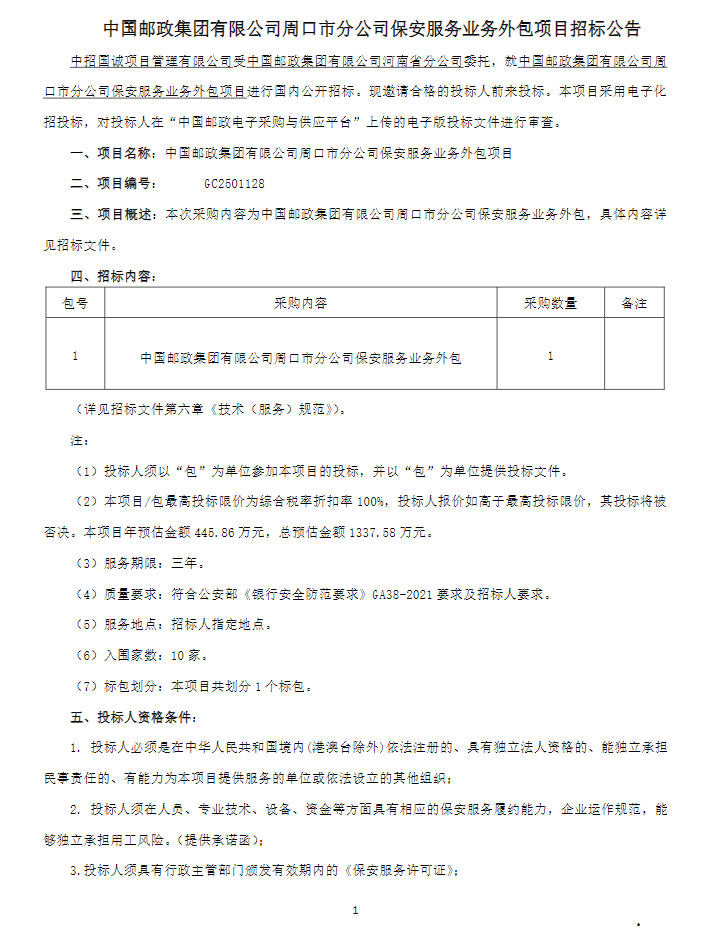 中国邮政集团有限公司郑州市分公司保安服务外包项目招标公告(招标编号:HNYZ-2025-15) 项目所在地区:河南省,郑州市 一、招标条件本中国邮政集团有限公司郑州市分公司保安服务外包项目已由项目审批
