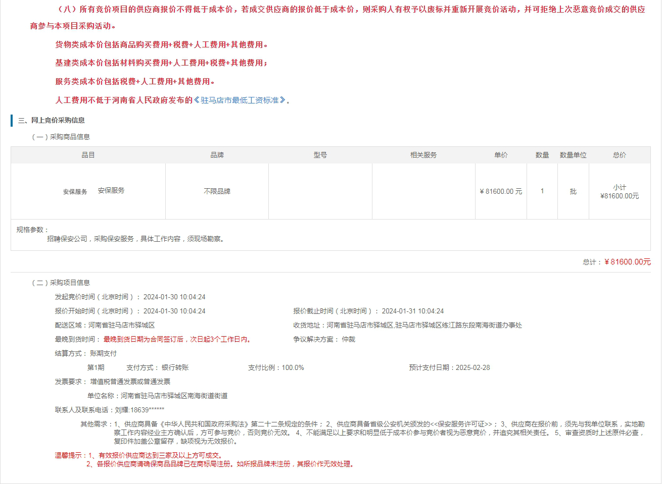 南海街道办事处安保服务项目 项目公告 1天前 竞价 南海街道办事处安保服务项目网上竞价公告 网上竞价