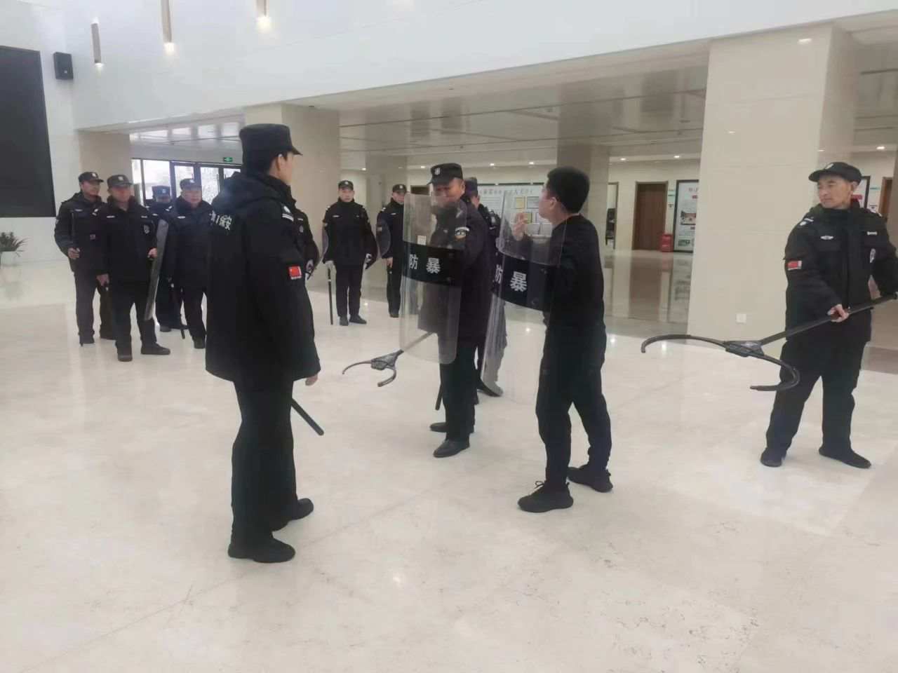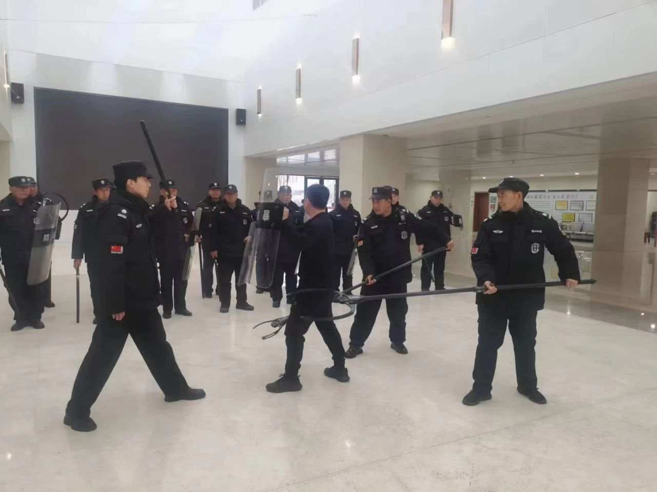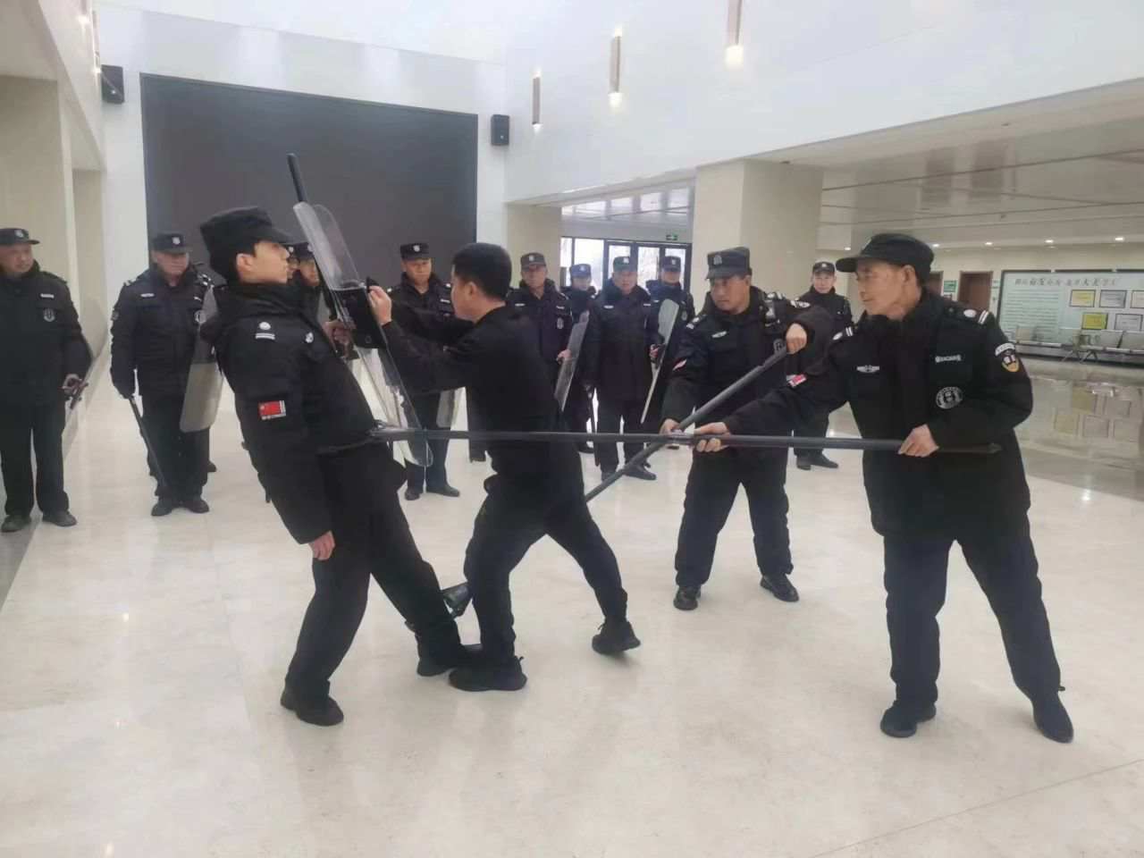 随后,向大家展示了防暴装备的使用及注意事项,通过现场示范,向大家详细讲解了在面对危险时,如何应对、怎样报警。接着又组织演练进攻与防范、多人合围和盾棍叉联动等实战演习。其间,穿插为大家讲解面对施暴者保安队员应如何应对,部分警械装备的操作使用以及恐怖袭击的特点和方式,并结合校园实际,教育保安员遇到恐怖袭击时如何应对,正确使用防暴钢叉、警棍、盾牌、U形抓捕器等防暴器械。