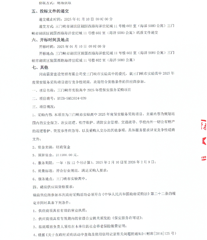 三门峡市实验高中2025年度保安服务采购项目竞争性磋商公告