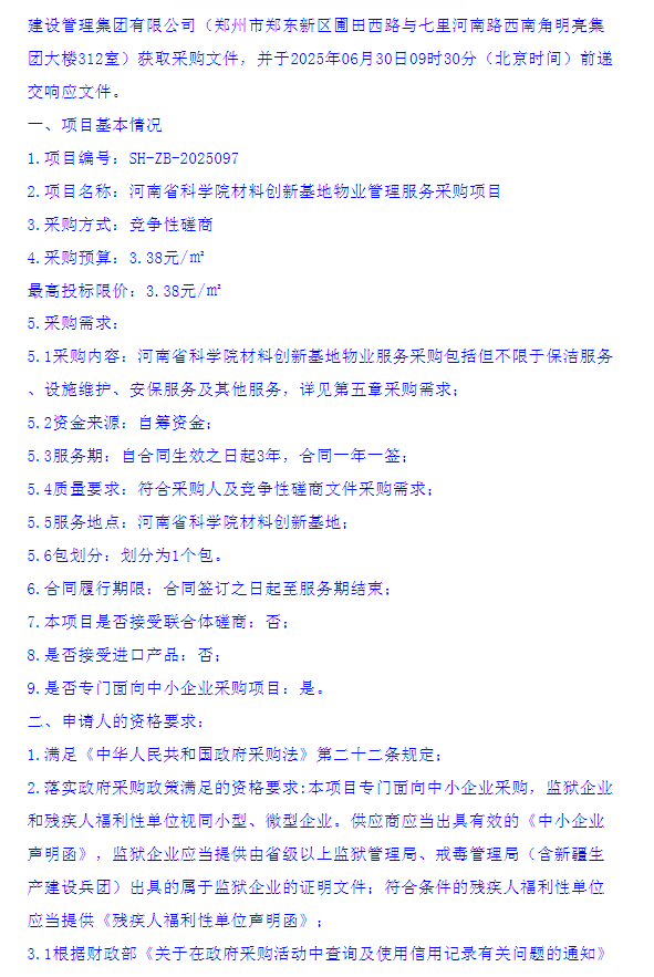 河南省科学院材料创新基地物业管理服务采购项目竞争性磋商公告