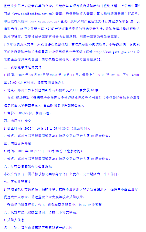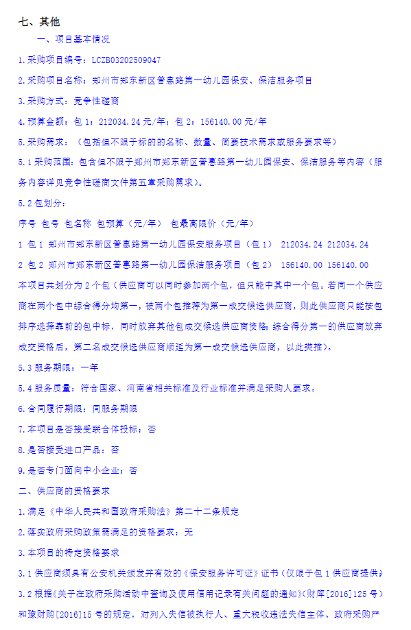 郑州市郑东新区普惠路第一幼儿园保安、保洁服务项目竞争性磋商公告
