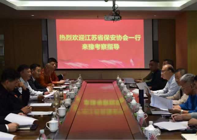 2025年10月14日至15日,江苏省政协社会法制和民族宗教委员会分党组成员、副主任,江苏省保安协会会长尚建荣率团赴河南开展为期两天的考察交流。河南省保安协会会长焦群才,副会长兼秘书长韩冰和相关企业负责人等参与座谈交流。