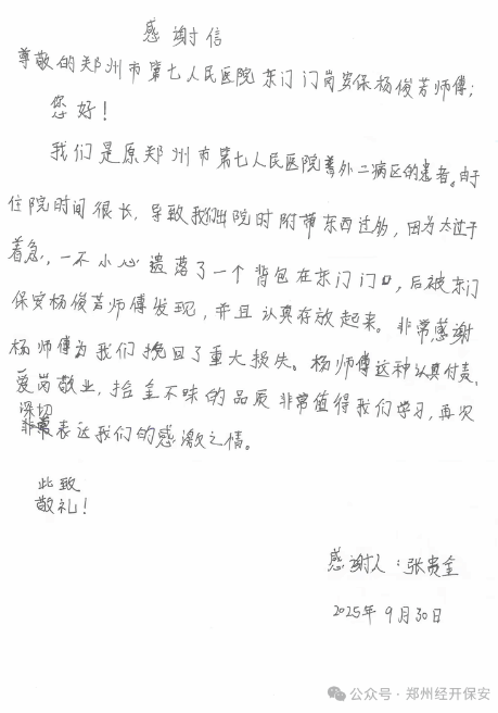 2025年10月9日,国庆中秋假期刚过,郑州保安集团经开分公司便收到一封来自市民张贵金的手写表扬信。信纸虽薄,却字字滚烫,字里行间满是对驻郑州市第七人民医院保安杨俊芳的感谢。