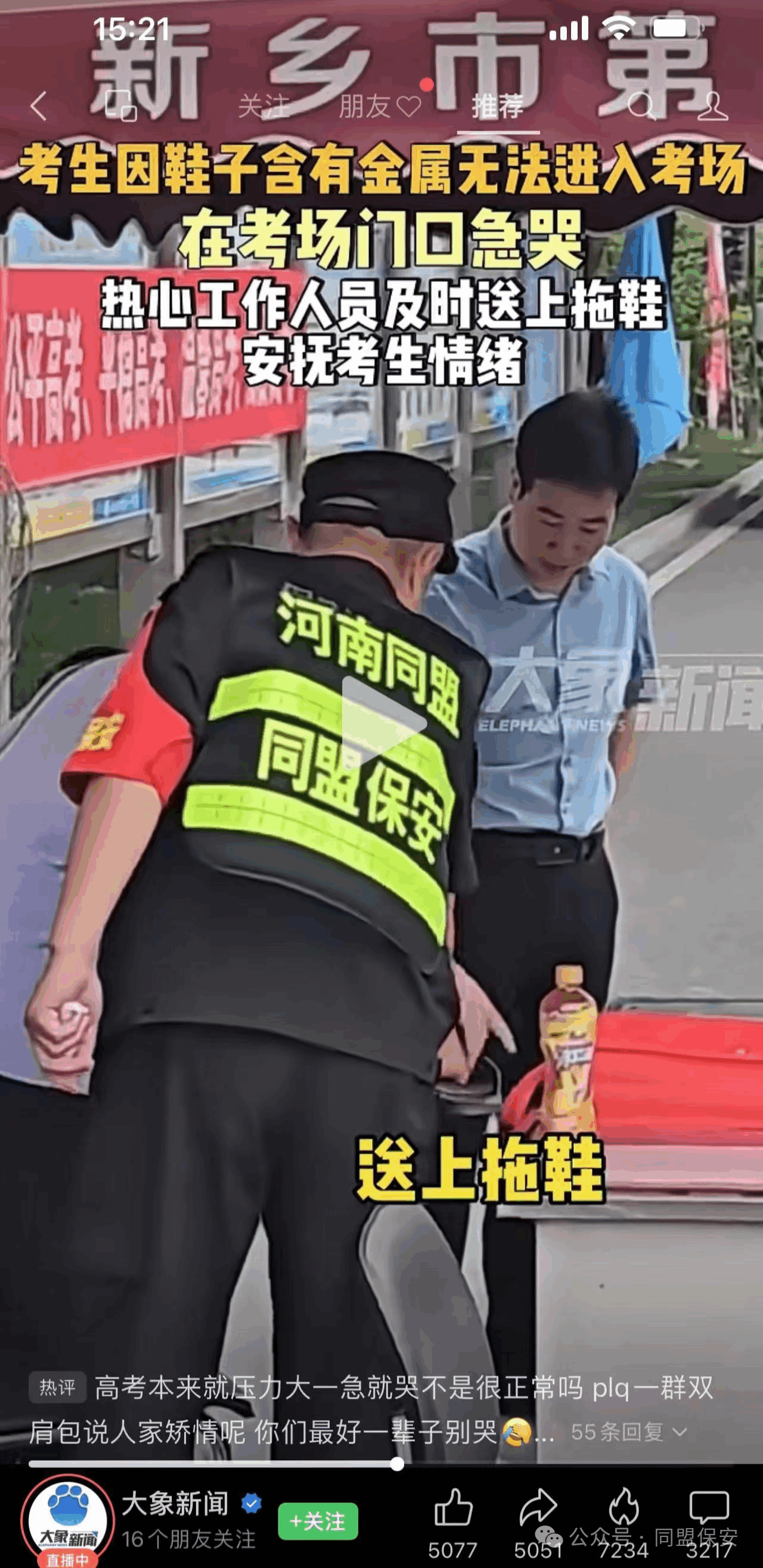 在这场关于梦想与未来的征途中,河南同盟保安公司共投入爱心助考车6台、保安人员100余名、饮料1000多件以及其他物品,以实际行动践行社会责任,为我市广大学子奉献了一份爱心。尤其值得一提的是,一中考点一位考生由于鞋子含有金属无法进入考场,助考的保安人员立即想办法,为该考生送来符合进入考场规定的鞋子,使该考生顺利入场参考,此事迅速冲上热搜,受到了广大网友的点赞好评。