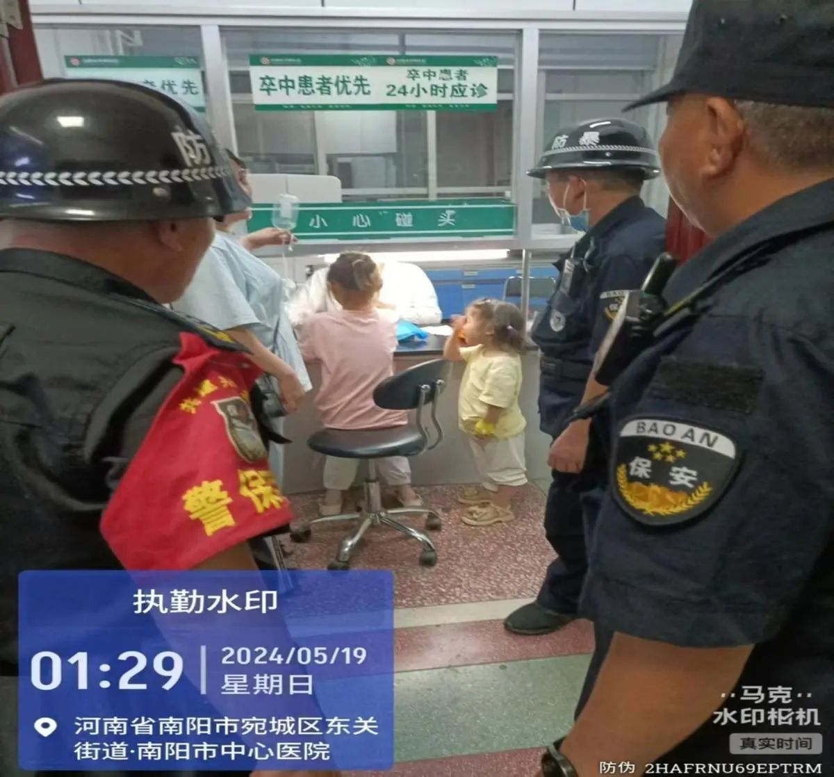 5月19日凌晨1时20分,夜班班长李俊如和队员姜国杰、石中伟、王鼎发现两个小女孩同时急需到门诊皮肤科就诊,由于门诊楼电梯正处于检修,几名保安同志不由分说便立即抱着小女孩改道楼梯向三楼奔去。经医生检查后说要验血,几位保安同志又抱起2个小女孩,匆忙到急诊抽血化验,后走步梯又把她们送到三楼住院治疗。据了解,两个小女孩的母亲叫孟某某,系南召县人,由于两个孩子当日不慎用药过敏。在情况紧急的情况下,遇到了好保安相助。孟女士激动得含泪答谢!