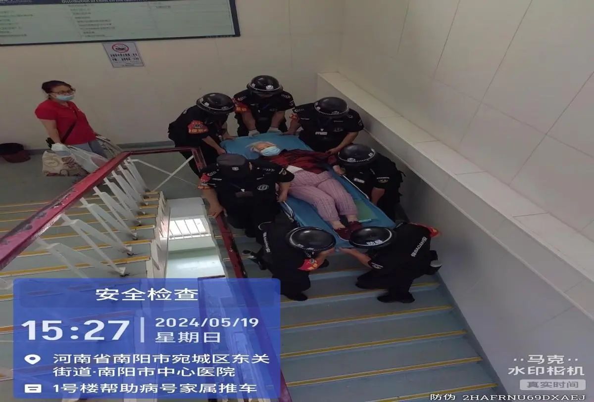 2024年5月18日上午,南阳市保安服务公司驻南阳市中心医院第九勤务大队大队长康红旗接到该医院保卫部门通知:因医院门诊电梯损坏,需要更新,工期约半个月。期间,患者需要上下楼做各种检查,行动不便的患者需要用担架抬上抬下,为了确保患者的救治不受影响,医院领导将此重任交给驻勤保安队。