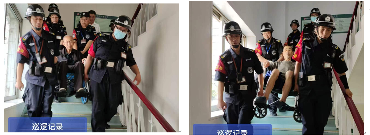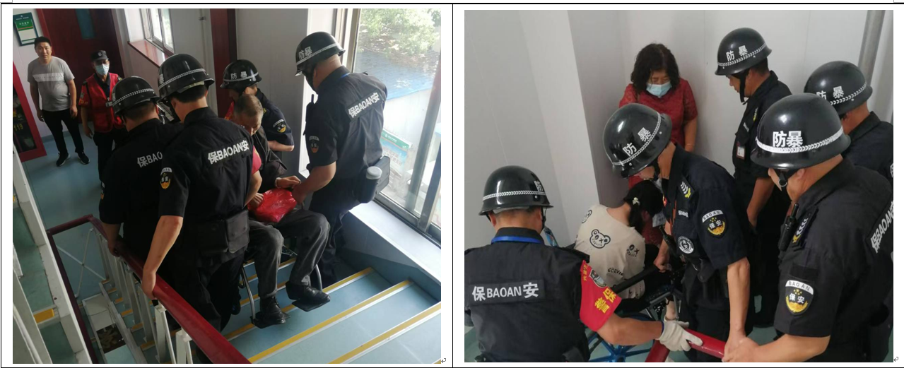5月21日,保安驻勤巡逻队接保安部通知,医院门诊楼四楼做内镜的几位病号,无法自行下楼。巡逻队随即赶到救援,把病人一个一个地安全抬下楼。