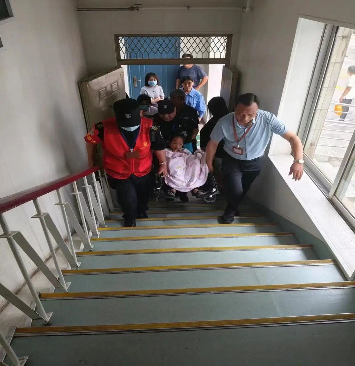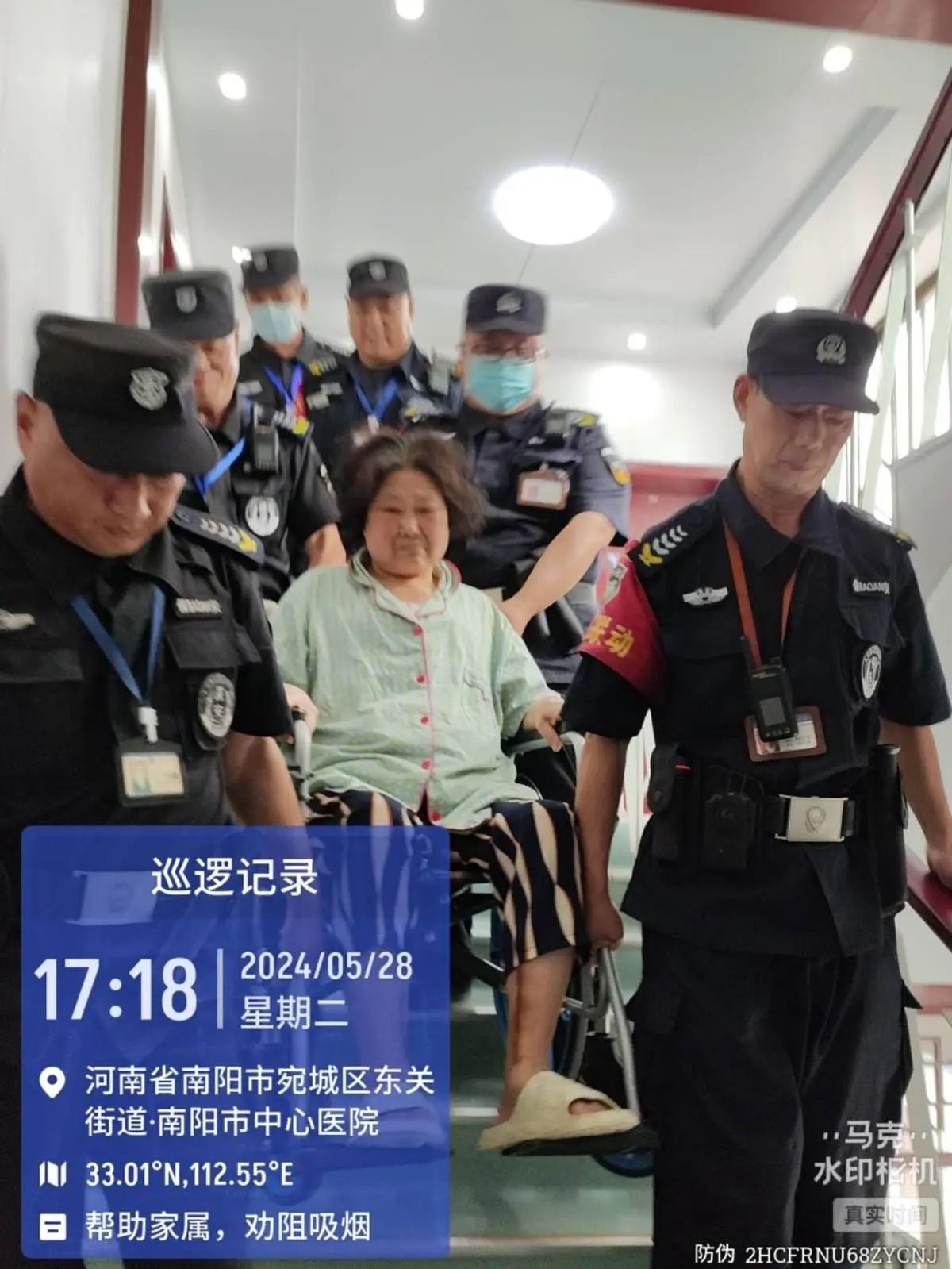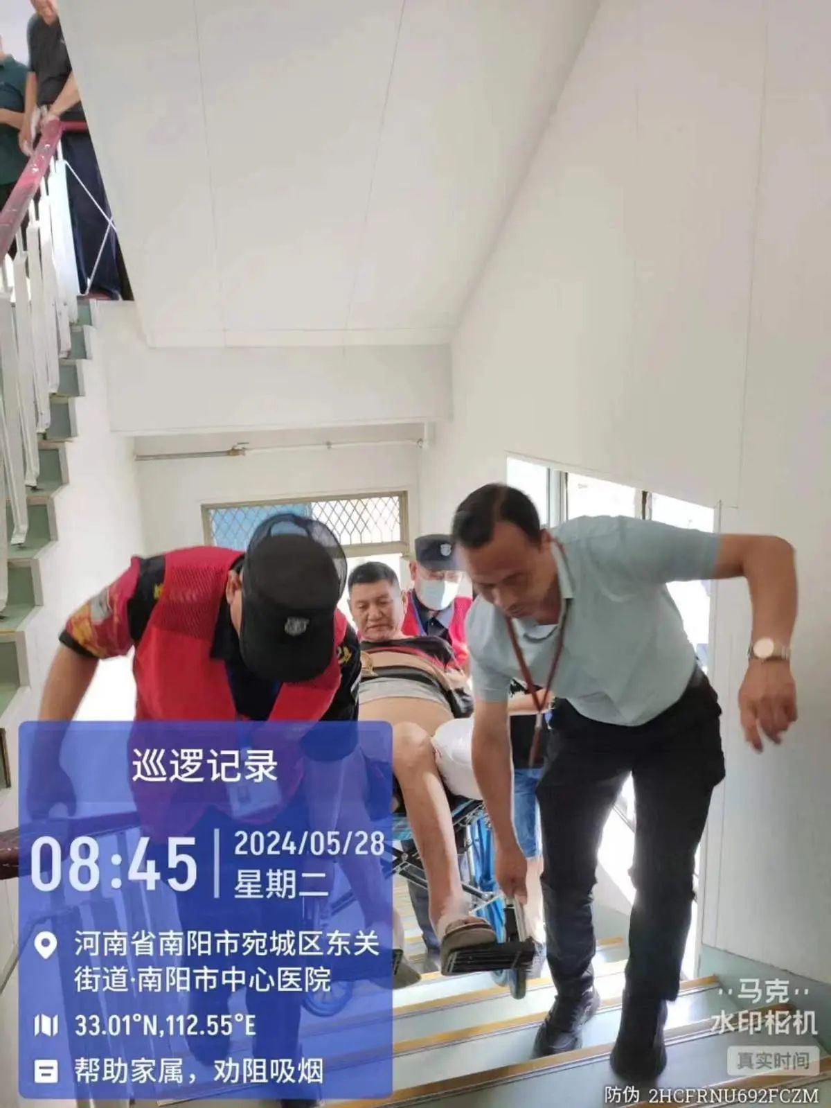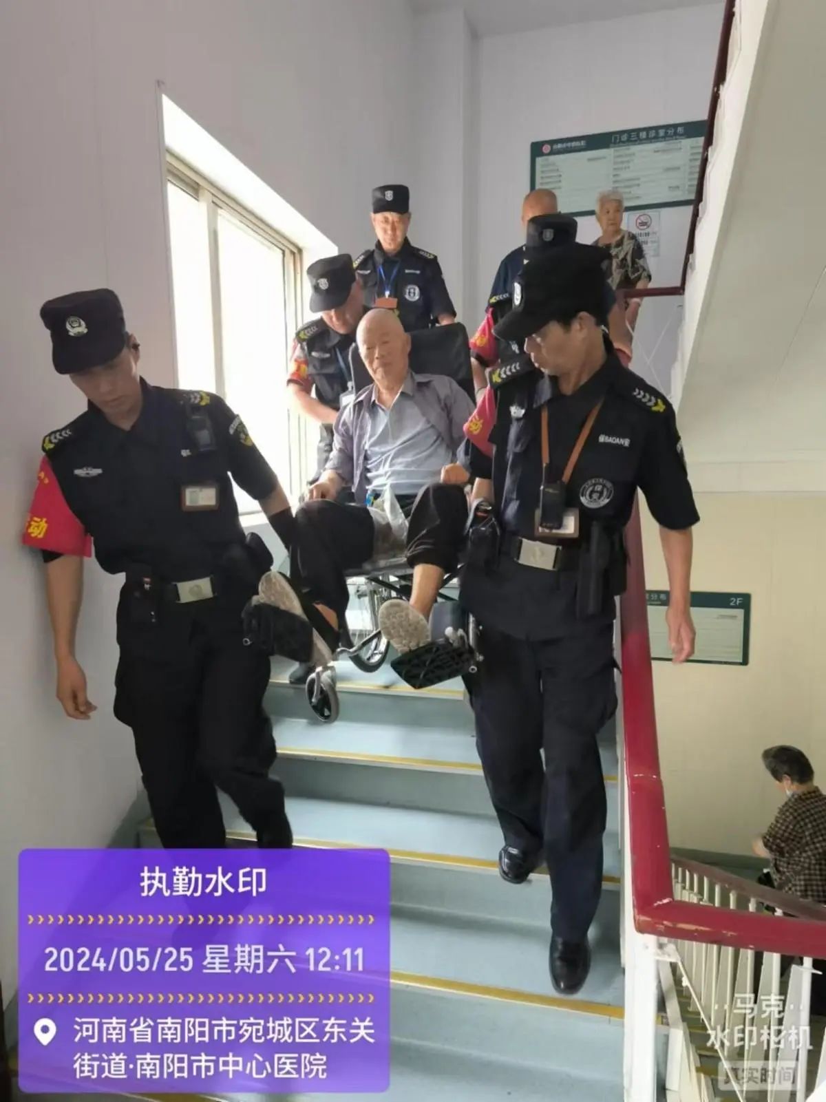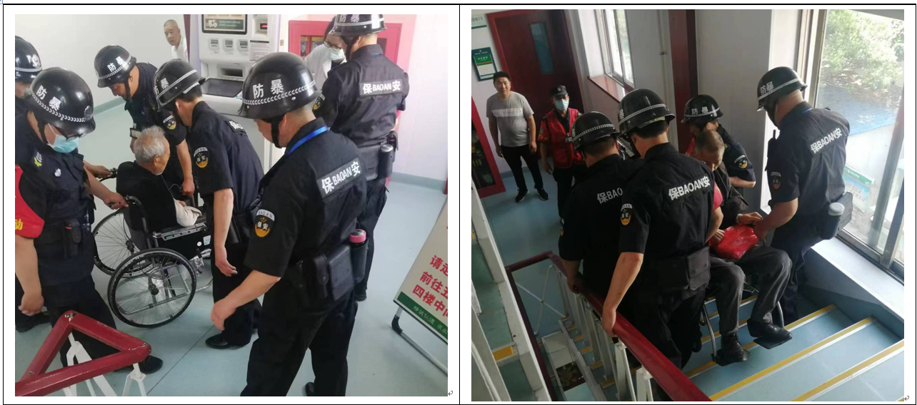 5月28日,这位先生体重有200多斤,需要到4楼做内镜检查,为了安全起见,王队亲自在前面抬着轮椅,几保安同志齐心协力把他抬了上去,等到做完检查又把他抬了下来。