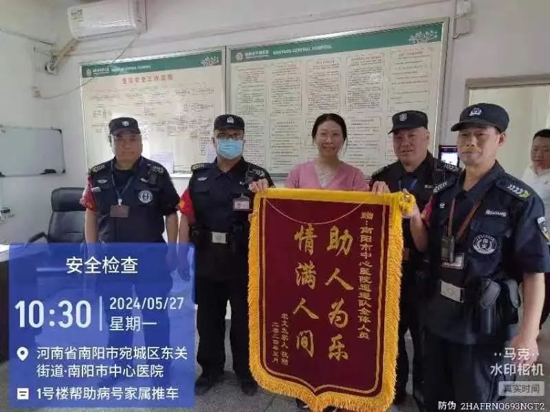 5月27日,患者家属宋女士来到南阳市中心医院,找到保安队长王风和,对保安巡逻队的同志们提出了表扬,并献上一面锦旗,上面写着“助人为乐,情满人间”。原来,在几天前,宋女士的父亲因病住院,需要做内镜检查,可是门诊楼的电梯正在维修,老人身体虚弱不能自己上楼,做完检查因为麻醉的作用,更是无法自己行走了。陪护老人的只有宋女士一个人,怎么办呢?保安队员出现了,把老人抬上了四楼,又在检查完后抬下楼,安全地护送回病房。这让宋女士非常感动,特地给全体巡逻队员送来了一面锦旗。