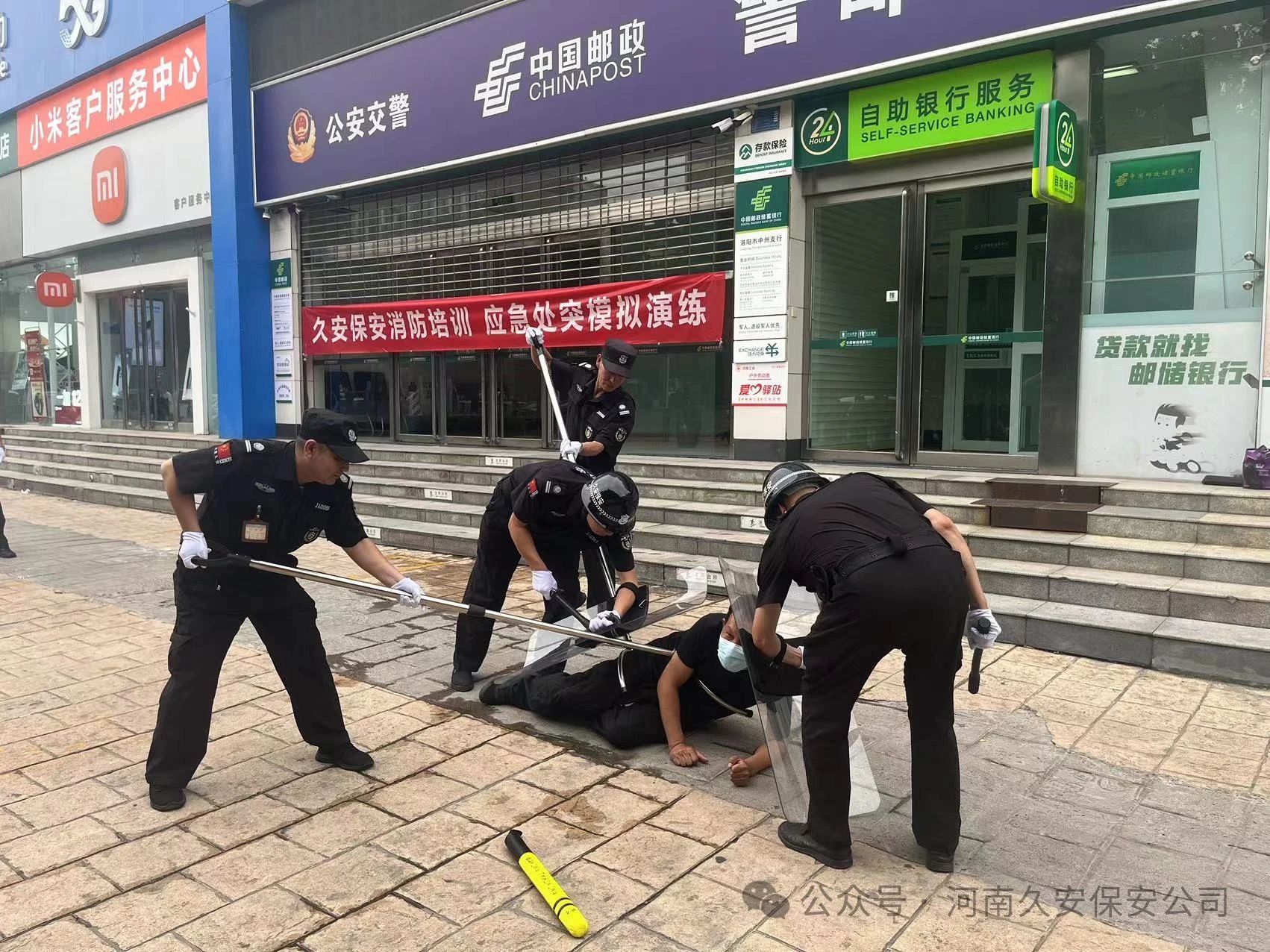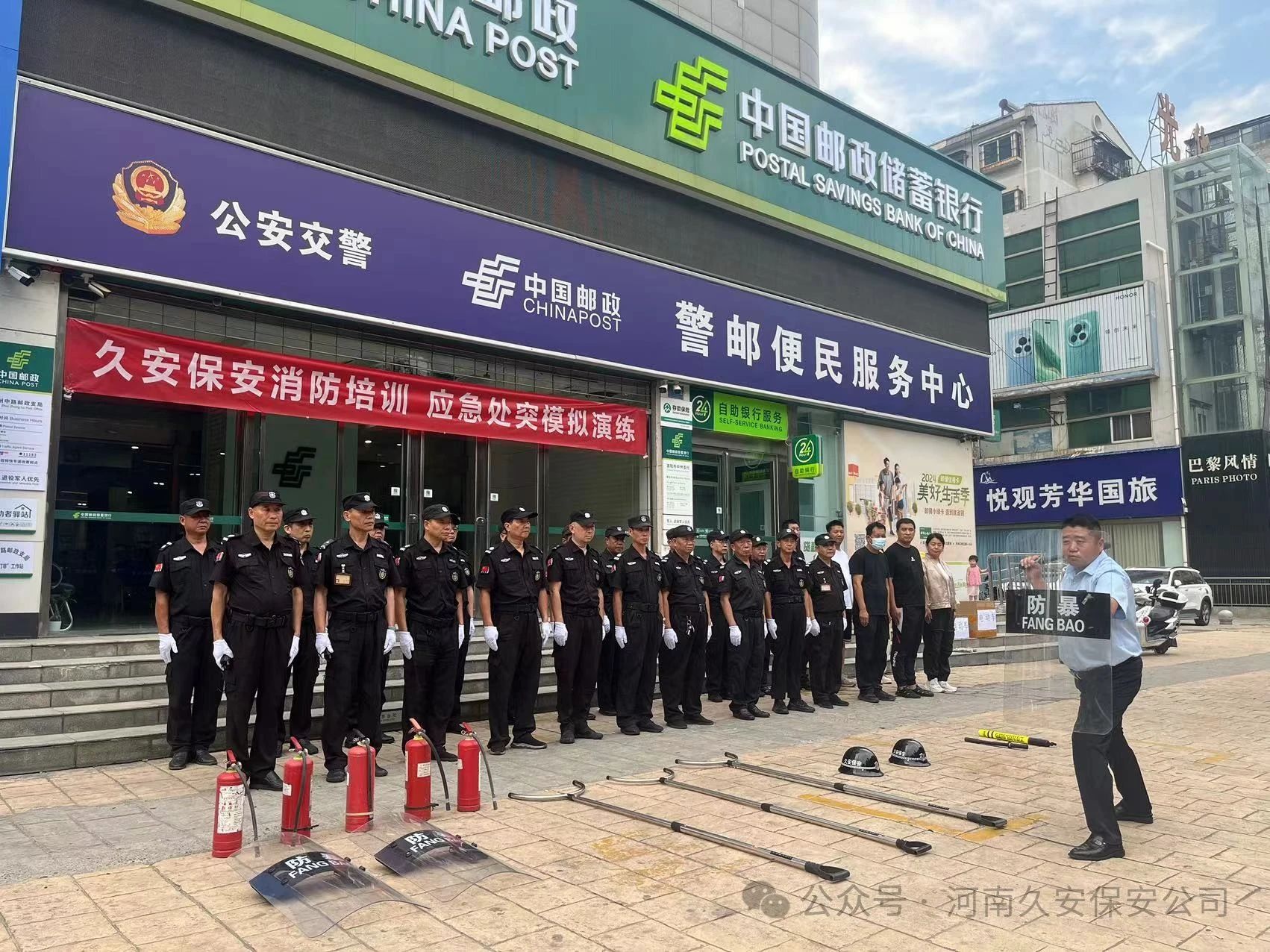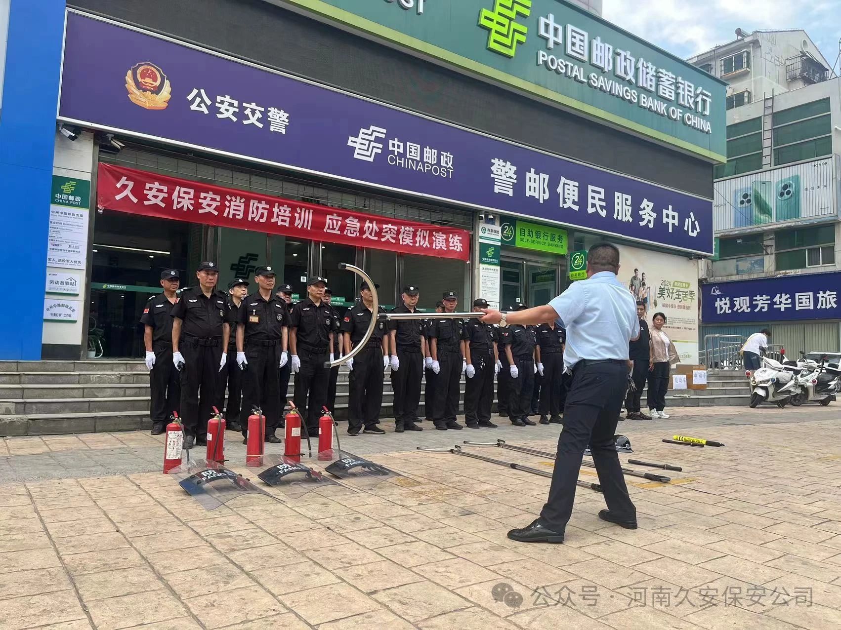 通过河南久安保安服务有限公司组织的2024年上半年消防培训、应急处突模拟演练,对进一步加强安全保卫工作,让队员们对金融机构安保的知识、消防安全知识得到了学习,对配备的器械使用方法,消防器材的使用方式,应急处突的方式有了更为深刻的认识。为银行财产的安全,做出有力的保障。