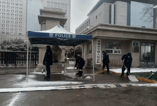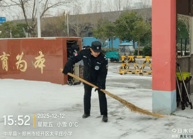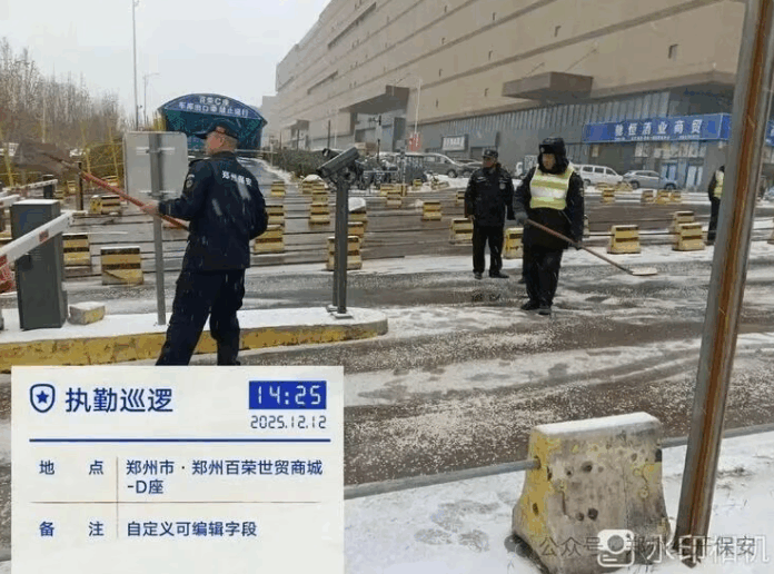 2025年12月12日,郑州初雪纷飞,银装素裹的城市里,路面湿滑给出行带来隐患。郑州保安集团经开分公司各岗点保安队员以雪为令,闻雪而动,迅速投入清雪除冰行动,用责任守护平安。