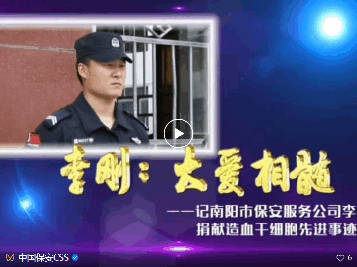 12月17日,微信公众号“中国保安CSS”以《寻找“最美保安|李刚:大爱相“髓”》为题,报道南阳保安服务公司押运六大队保安员李刚,坚持义务献血16年,为血液病患者捐献造血干细胞的感人事迹,全面记述了他立足本职、忠于职守、奉献社会的无私大爱,展示了一名共产党员的优秀品格。
