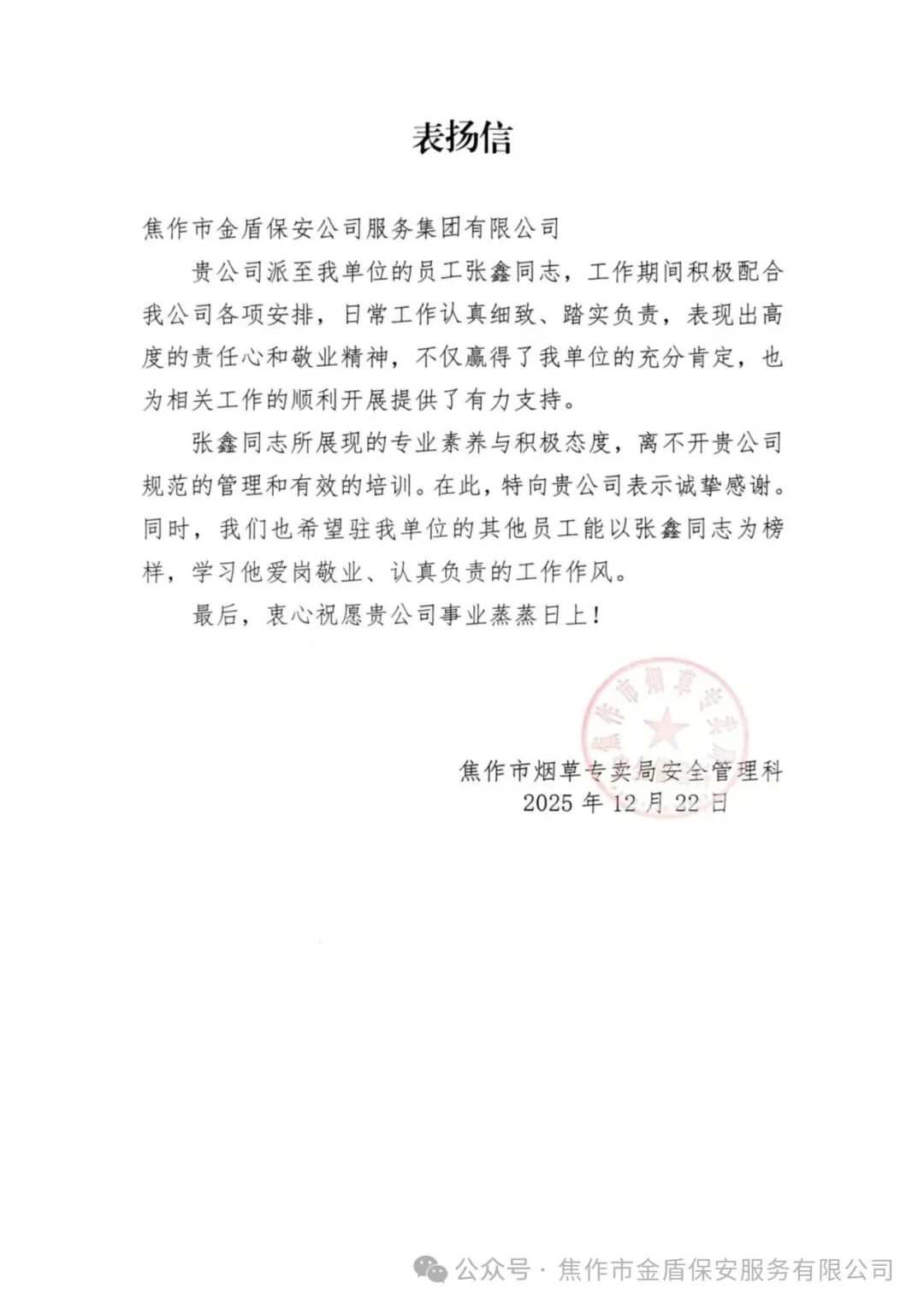 焦作金盾人防七部保安员受到客户单位表扬