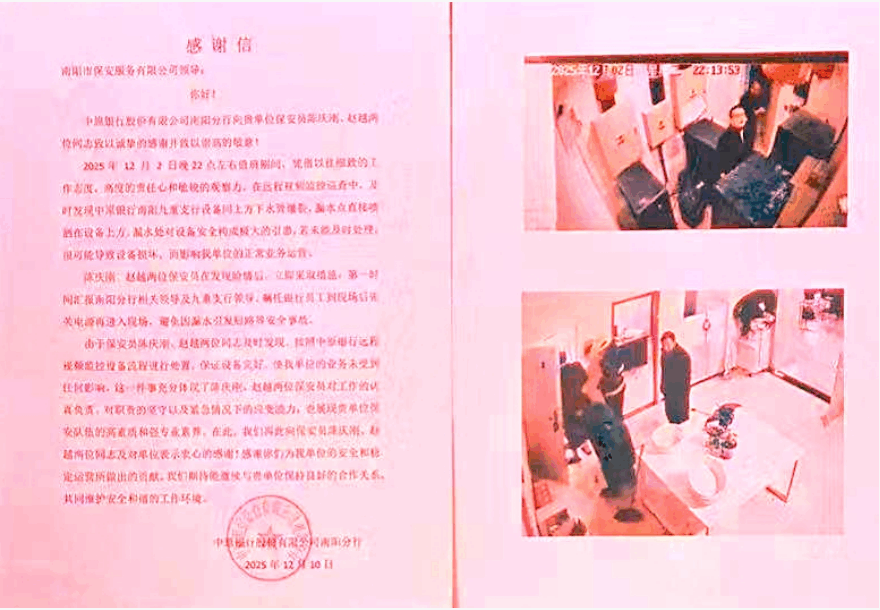 日前,中原银行股份有限公司南阳分行给南阳市保安服务公司送来一封感谢信,信中反映驻勤队员陈庆刚、赵越两位同志在远程视频监控巡查中发现险情,随即采取得力措施果敢处置,避免了一场安全事故发生,受到该行领导和职工的好评和赞扬。