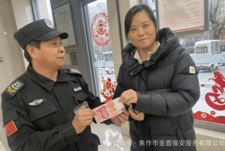 1月4日16时20分,焦作金盾保安服务有限公司人防三部驻中国银行新区支行执勤保安郑焕有在ATM机巡查时,发现了遗落在ATM机上的现金一百元,随即将一百元钱上交至大堂经理。然后和大堂经理一同寻找失主。通过查找监控、多方联系,终于找到了失主。失主返回领取自己遗落的现金时,对中行保安队员郑焕有拾金不昧的精神表示赞扬。