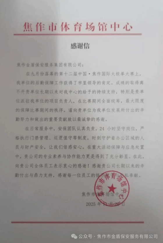 在第十二届中国•焦作国际太极拳大赛中,人防一部、二部凭借优质的安保服务受到客户单位表扬。