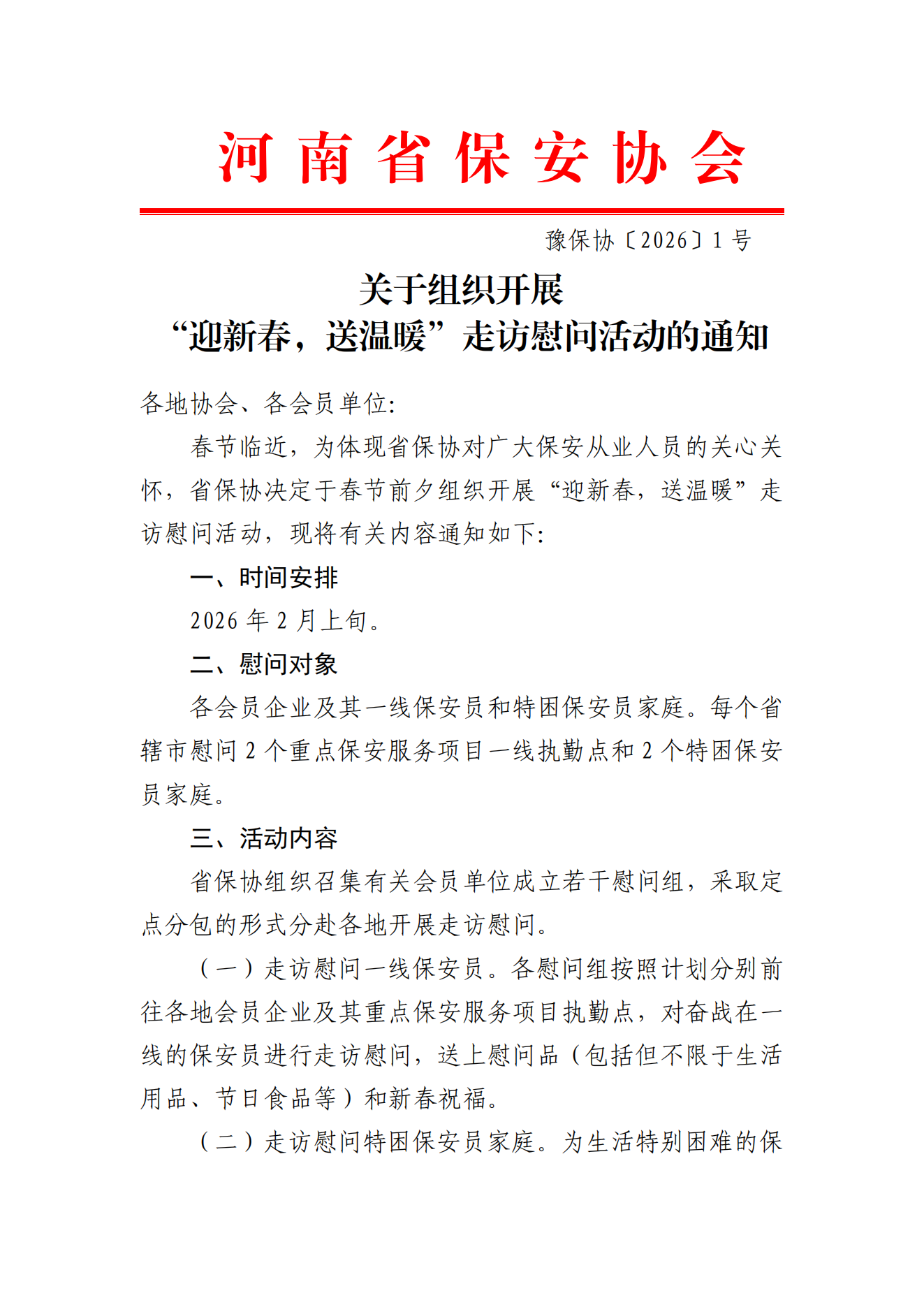 河南省保安协会关于组织开展“迎新春,送温暖”走访慰问活动的通知