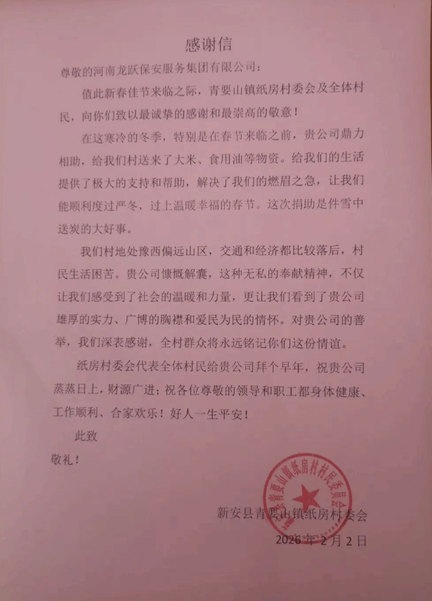 纸房村地处豫西偏远山区,交通不便、经济相对落后。在寒冷的冬日里,龙跃保安集团的爱心物资,切实解决了村民们的燃眉之急,让大家能够温暖过冬、安心过年。纸房村村委会代表全体村民,向龙跃保安集团赠送了感谢信,对企业的慷慨相助表示衷心感谢,并送上新春祝福。感谢信中写道:“贵公司的无私奉献精神,让我们看到了企业雄厚的实力、广博的胸襟和爱民为民的情怀,这份情谊我们将永远铭记。”