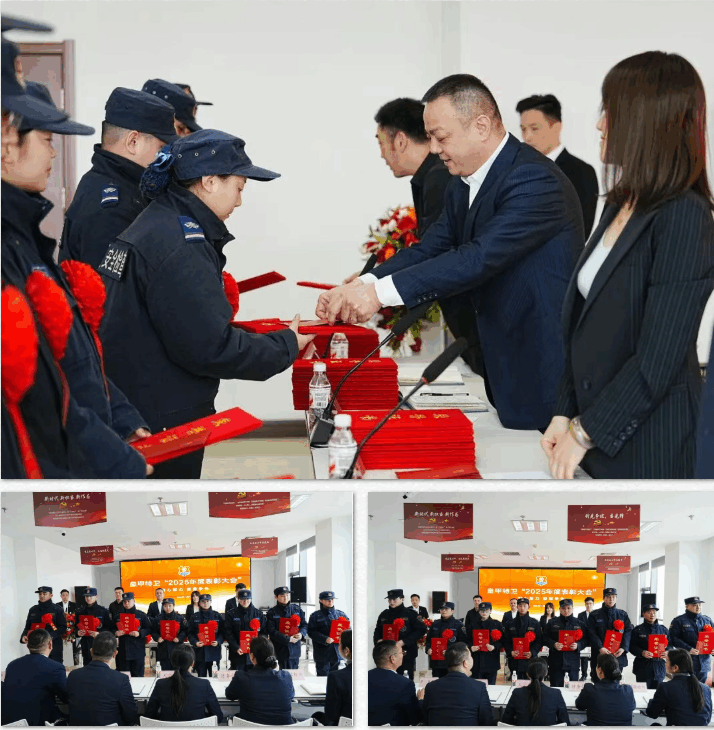 大会表彰年度“优秀项目”2个,“优秀班队长”14名,“优秀队员”35名。一组组镜头、一项项数据,映照出皇甲人对安全的执着与专业。他们扎根门岗、巡逻、处突一线,以严谨与勇敢诠释“忠诚、仁义、英勇、专业”的皇甲精神,让平凡岗位成为守护堡垒,把细节点滴铸成安全的屏障。