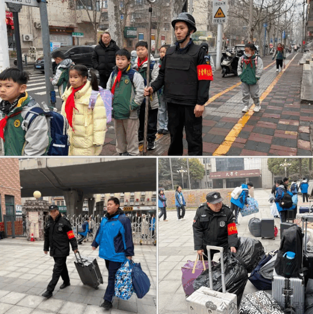 开学首日,学校保安志愿者坚守“护学岗”,在校园门口及周边疏导交通、引导人流,帮助返校学子搬运行李,用心守护学生平安通行,筑牢校园安全防线。