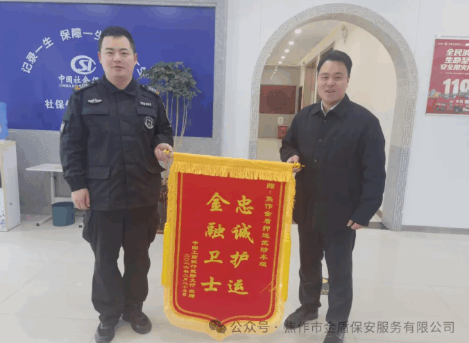 3月4日下午,工商银行武陟支行将一面印有“金融卫士 忠诚护运”的锦旗赠予叫做金盾工行押运大队武陟车组,对车组长期以来安全准时、规范高效的武装押运服务表示高度认可与诚挚感谢。