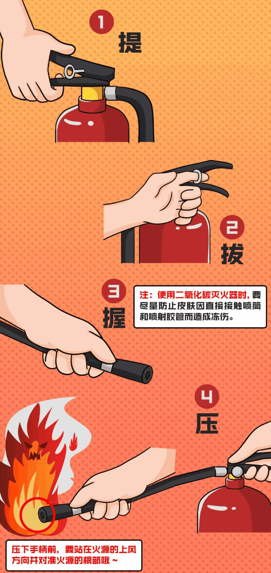如遇初起火灾学会使用灭火器✅️记住“提、拔、握、压”