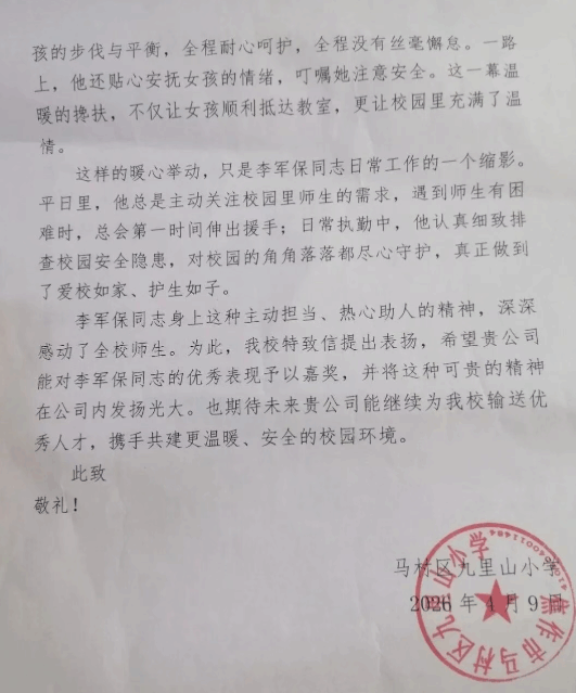 长期以来,焦作金盾人防五部保安员李军保安保工作认真负责、爱岗敬业、热情服务、爱护学生,得到客户单位师生们的认可与好评。近日,九里山小学送来一封表扬信称赞其“爱校如家 护生如子”,这是对李军保的表扬,也是对公司安保服务质量的肯定。