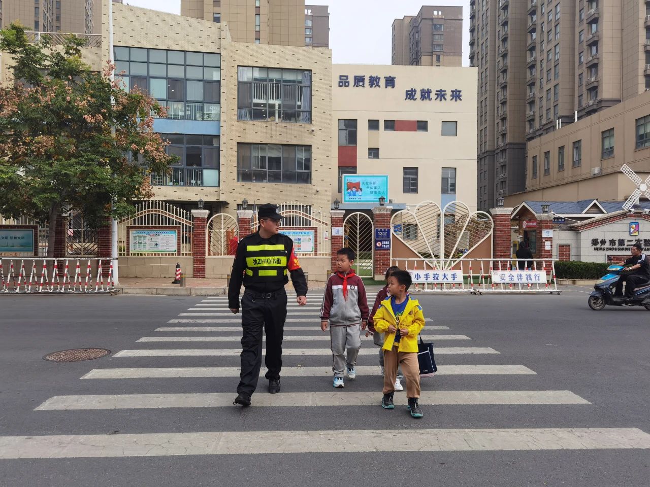 此外,郑州保安集团中原分公司以护学为主,每天组织队员,在郑州市实验小学,开展“义务护学”,与辖区派出所、交警部门、校园保安、教师志愿者、社区网格员等共同参与的护学队伍,进一步筑牢校园安全屏障,营造和谐稳定的校园周边环境。