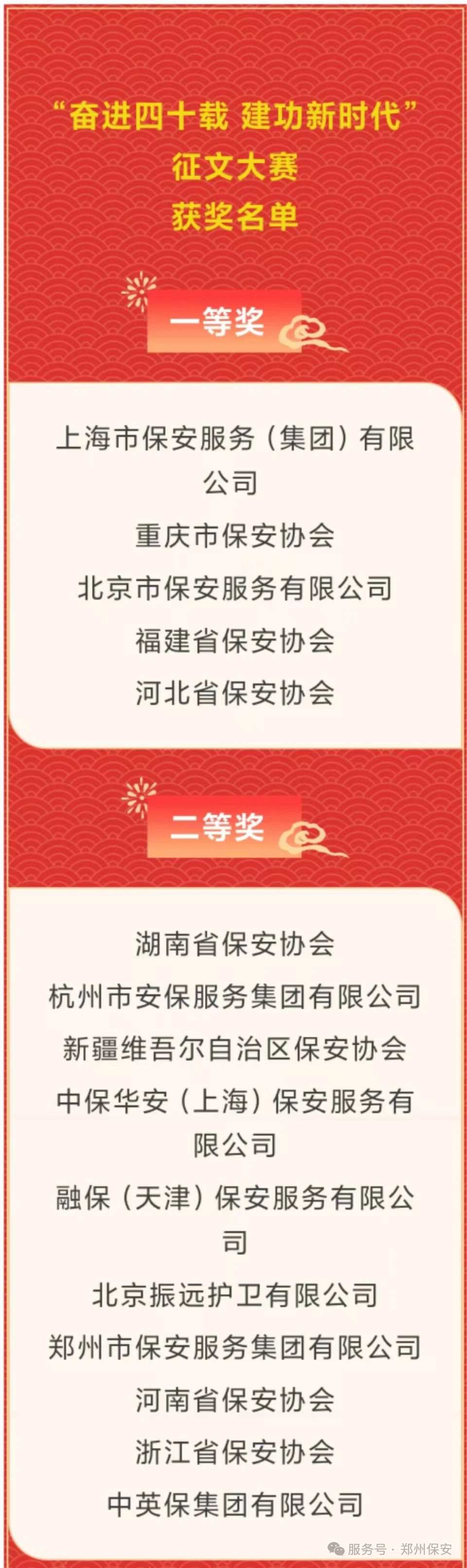 岁末传佳音,华章启新程!在2024年的最后一天,郑州保安集团喜获殊荣——中国保安协会近日公布了“中国保安服务业四十周年短视频大赛”和“征文大赛”评审结果,集团凭借出色的表现,荣获短视频大赛“保安企业形象类”二等奖和征文大赛二等奖,为这一年画上圆满的句号,完美收官。