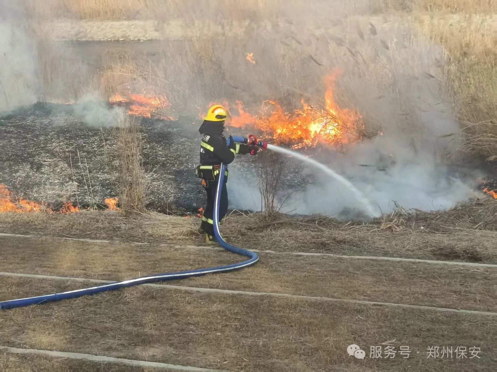 16日下午3时,正值游客休闲游玩之际,保安队员王勇利、焦银亮、李喜长、张辉在日常巡逻至廊桥下游时,王勇利敏锐发现远处有浓烟,凭借丰富的巡逻经验与职业敏感度,判定有火情,立即向上级汇报,并携带消防器材和铁锹等赶往起火点。由于起火点干草、芦苇丛生且当日风力较大,火势迅速蔓延,火情较难控制。王勇利立即拨打119报警电话,同时设立警戒线,开展初期灭火工作,为后续救援争取宝贵时间。消防人员到场后,双方并肩作战,成功将火扑灭。