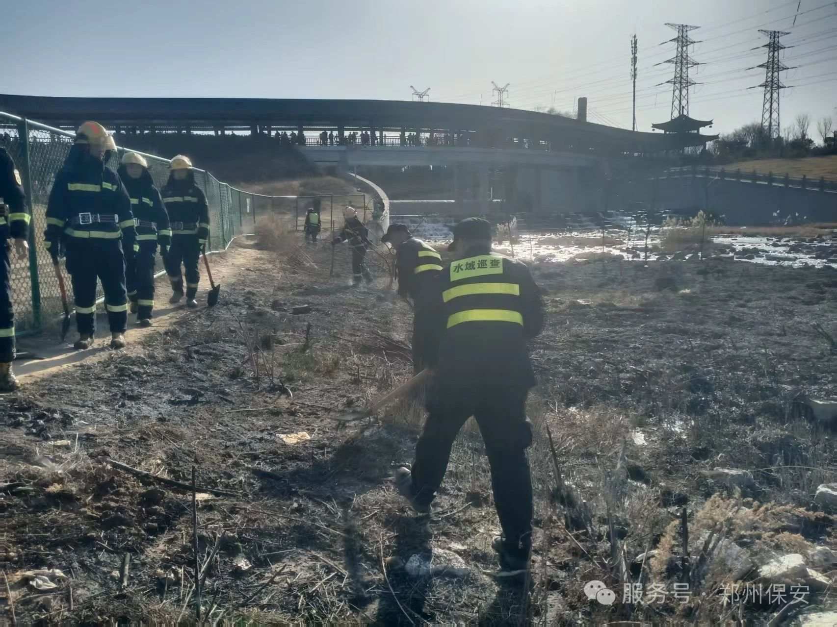 2025年2月16日至17日,郑州蝶湖公园廊桥下游突发两起较大火情,过火面积达400平米。在这危急时刻,集团直属五分公司驻蝶湖公园的保安队员凭借扎实的专业素养和快速响应能力,与消防部门协同作战,成功控制火情,保障了公园设施及市民的生命财产安全。