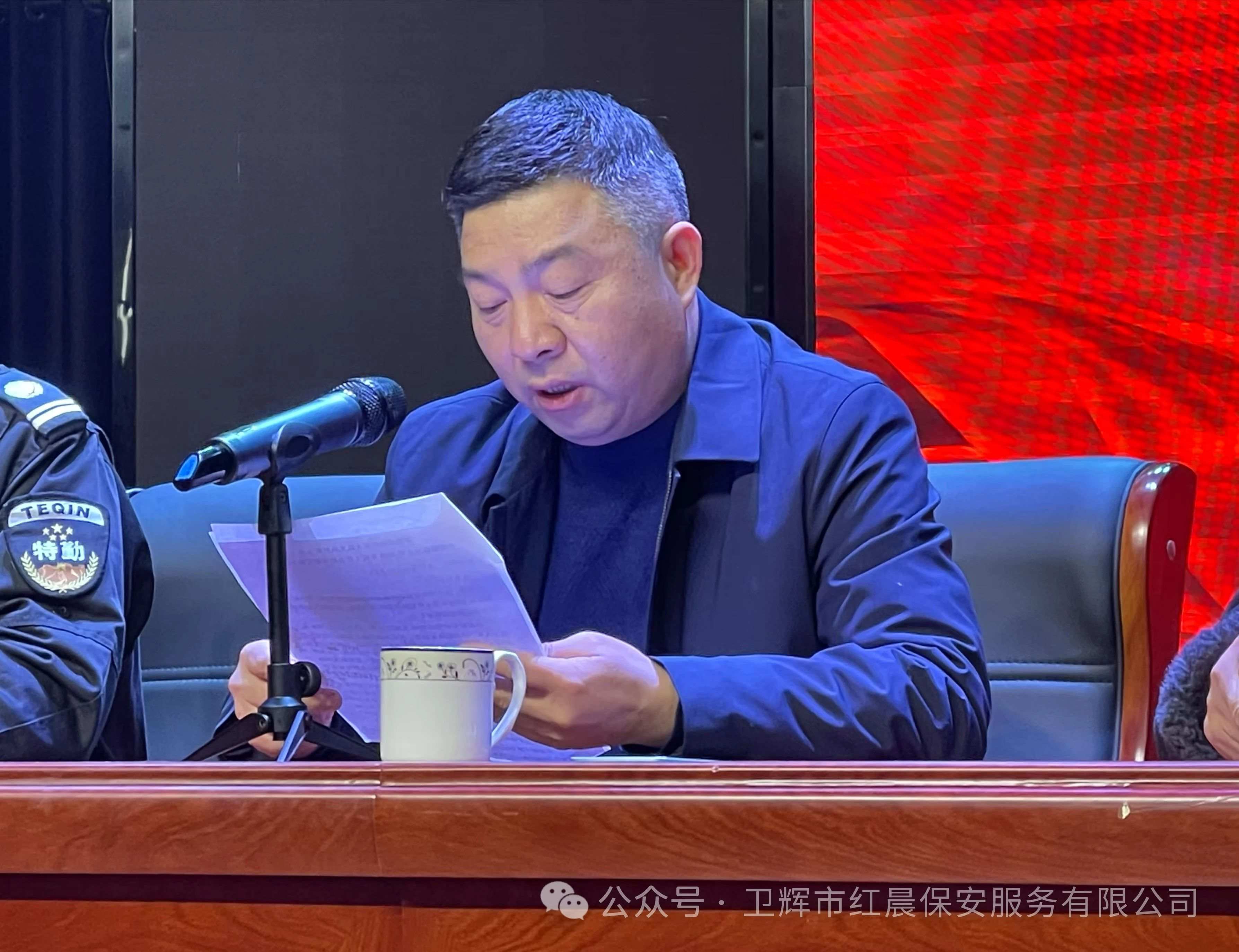 市公安局治安大队大队长靳玉文发表了指导讲话,对获奖的集体和人员表示热烈祝贺,并对红晨保安公司2024年的工作给予了高度评价。