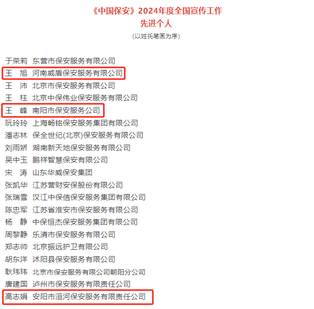 欣闻洛阳龙跃保安服务有限公司及河南威盾保安服务有限公司王旭、南阳市保安服务公司王峰、安阳市洹河保安服务有限责任公司高志娟同志荣膺《中国保安》2024年度全国宣传工作“先进集体”与“先进个人”荣誉称号,特此致以热烈祝贺!
