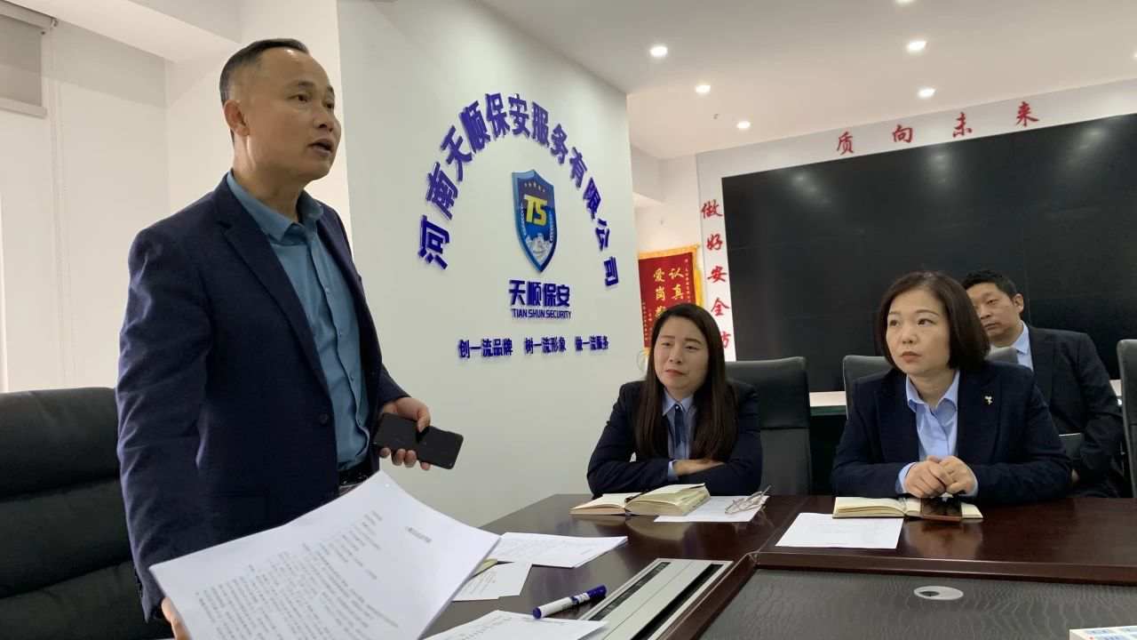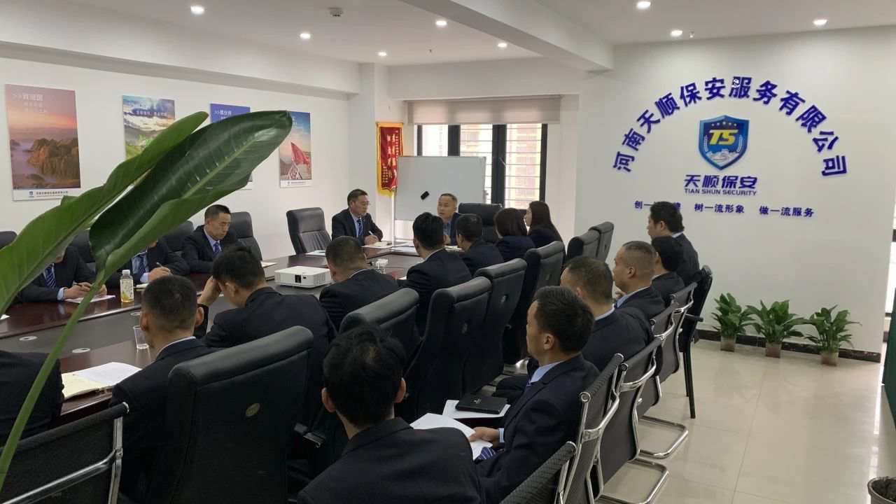 下午在河南天顺保安总部会议室。在赵总和黄副总的主持下,对近期各项目具体情况进行梳理总结。同时按照公司制度章程对相关人员进行点评,严格落实奖惩制度。随后带领各骨干人员按照制定的业务内容进行内部培训。