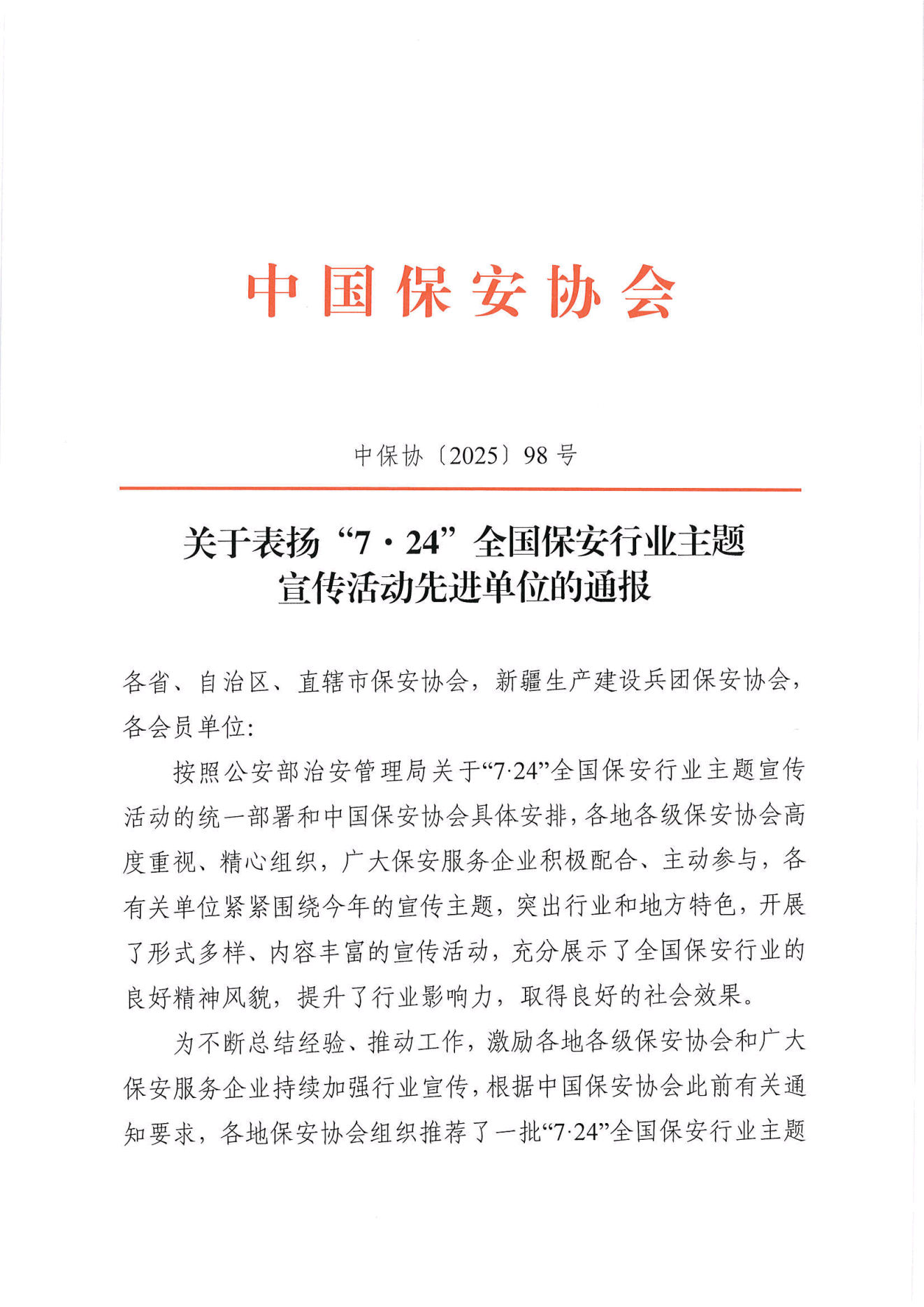 9月5日,中国保安协会发布《关于表扬“7·24”全国保安行业主题宣传活动先进单位的通报》,我会及多家会员单位上榜。